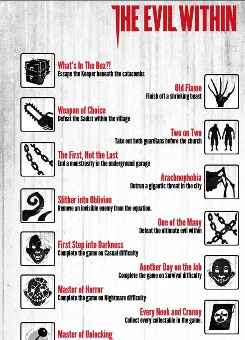La distribuidora Bethesda ha revelado la lista de logros / trofeos completa de The Evil Within. Ha revelado la lista en forma de mini-juego en donde debes resolver un puzle para desbloquear el enlace que lleva a la información. La encontrarás a continuación sin necesidad de resolver nada.