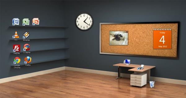 Por ejemplo, si has descargado un fondo de pantalla con una habitación puedes mover los accesos directos que más utilices en las estanterías, dejar los archivos en los que estás trabajando sobre la mesa y colocar la papelera de reciclaje junto a ella. De este modo conviertes tu wallpaper en una pequeña habitación virtual que debes mantener limpiar.