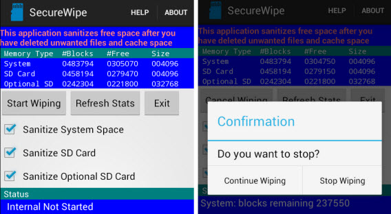 Secure Wipe limpia el espacio libre de la memoria interna y de la tarjeta SD para que ningún archivo borrado pueda recuperarse con herramientas como Recuva o DiskDigger. Es mejor usarla cuando el teléfono o la tablet está en carga, puesto que el proceso de borrado tarda bastante tiempo.