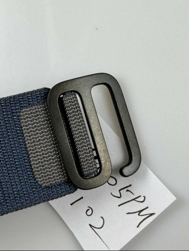 Las imágenes compartidas por DongleBookPro en X muestran un prototipo del Alpine Loop en azul con un enganche y fijaciones de titanio anodizado en negro. Un diseño que contrasta claramente con la versión lanzada del Alpine Loop, que presenta un acabado de titanio natural para coincidir con la caja del Apple Watch Ultra. Unas imágenes, de poder confirmar su autenticidad, que respaldan la existencia de los planes de Apple para un color más oscuro al tiempo que plantean preguntas sobre por qué la compañía decidió no avanzar con esta opción.