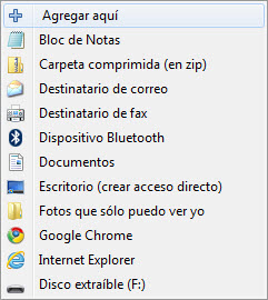 Ten encuenta que si conectas una unidad de disco extraíble, ésta aparecerá automáticamente en el menú Enviar a, pero no se podrá ver en la carpeta SendTo.