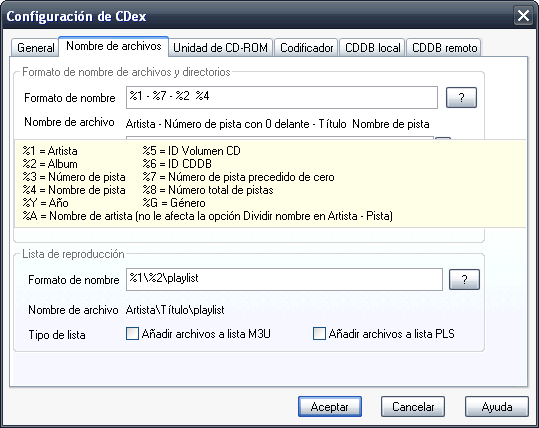 Por defecto, el nombre de los archivos es: %1\%2\%7-%4, que está bastante bien, pero personalmente prefiero %1 – %7 – %4. Así se ve mejor la canción y no se repite el nombre del álbum en todas ellas.