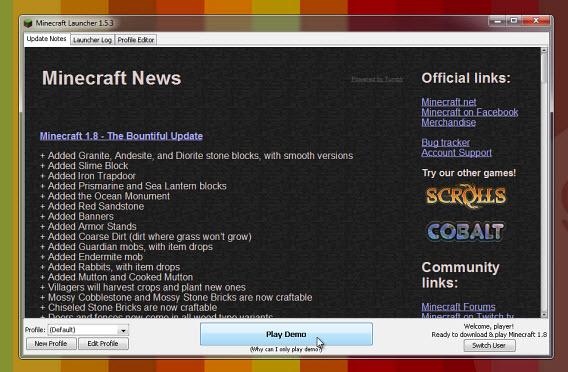 En “Use version” elige una cualquiera de las versiones antiguas (yo recomiendo la old_beta b1.6.4), guarda el perfil y luego haz clic en “Play Demo”. Verás que el juego no es una demo, sino una versión antigua completa.