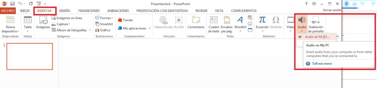 Para ello, cliquea en la parte superior en “Insertar” y selecciona “Audio”. Acto seguido, busca el apartado “Audio en mi PC” y localiza el sonido en cuestión. El resto no es más que darle a “Insertar” para que se guarde en la diapositiva.