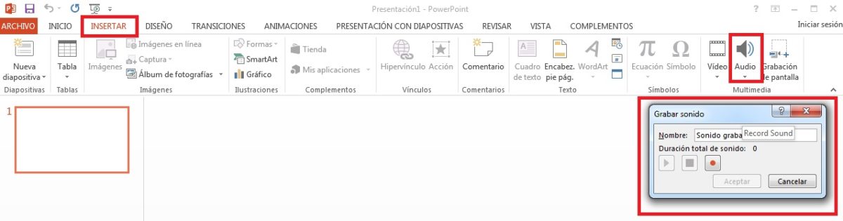 Para lograr esto, de nuevo nos vamos a “Insertar”, “Audio” y ahora seleccionamos la acción que aparece debajo, la de “Grabar audio”. Si te fijas bien, Powerpoint abre una nueva ventana donde podemos cambiar el nombre del audio y empezar la grabación pulsando en el icono rojo. El resto no es más que darle al “Play” o “Pause”. Cuando termines, cliquea en “Aceptar”.