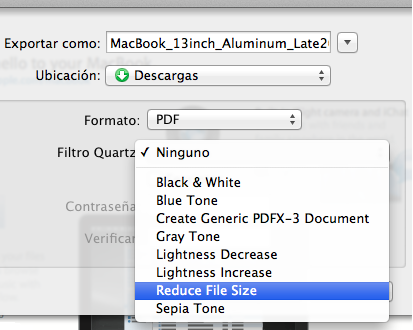 Para ello deberás abrir el PDF con Vista Previa y seleccionar la opción Exportar. Con Filtro Quartz puedes personalizar el color de las imágenes y, lo que nos interesa, comprimir el PDF.