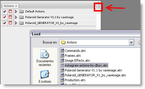 Una vez hecho esto, abre Photoshop y a continuación el panel Acciones (Actions), desplegando acto seguido el menú a la derecha de la barra tal como ves en la imagen.