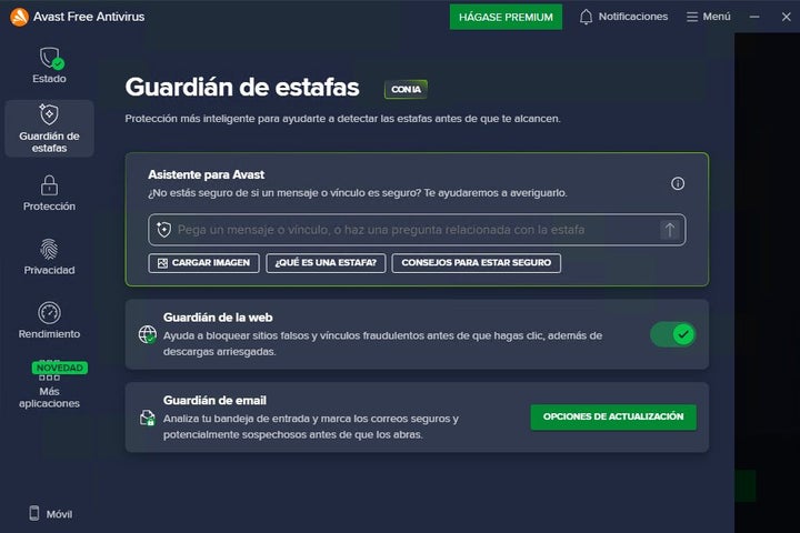 La protección frente a fraudes online es uno de los puntos clave de Avast Free Antivirus. A través de Web Guard, la solución ayuda a detectar sitios web potencialmente peligrosos, enlaces maliciosos e intentos de estafa.