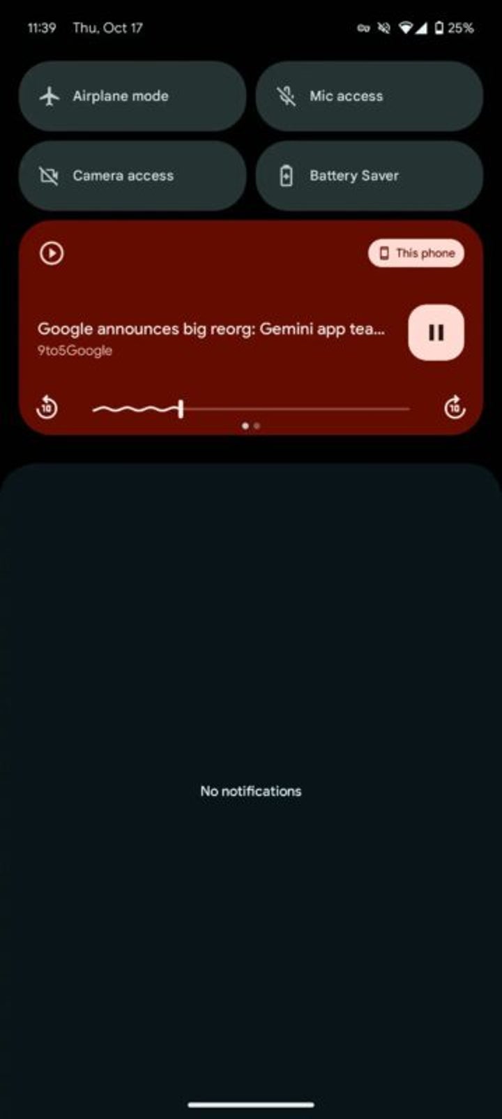 Al cambiar de app, Chrome muestra el artículo en el panel de notificaciones como un reproductor multimedia, que incluye controles para reproducir o pausar el audio, y opciones para adelantar o retroceder 10 segundos. También se destaca el titular y la página web que estás escuchando, todo ello de manera accesible y organizada.
