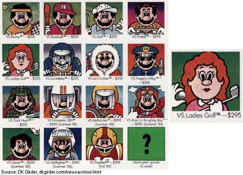 En el año 1985, apareció un anuncio impreso para promocionar la máquina. Como eran quince juegos, a Nintendo se le ocurrió mostrar quince versiones diferentes de Mario, cada una basada en uno de estos juegos. Y lo más curioso es que para el juego VS. Ladies Golf, vemos a quien podría ser la versión mujer del fontanero de Nintendo.