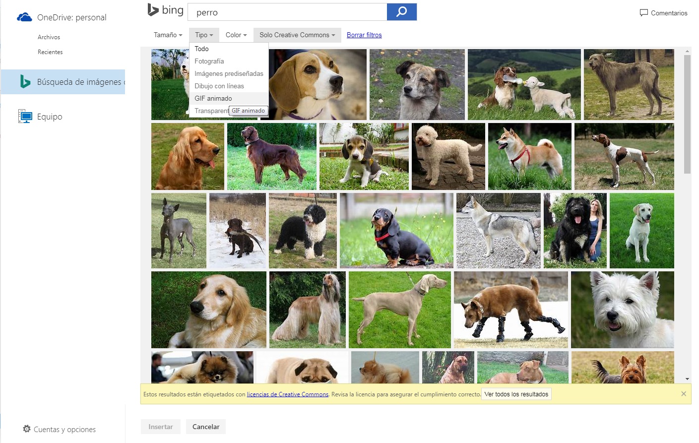 Para entrar en él sólo hay que pulsar en el botón de añadir imagen y verás que junto a la opción de subir imágenes desde el equipo o desde la nube también aparece “Bing”. Sí, ahí está la clave. Busca la imagen que más te interese y en “tipo” selecciona “GIF imagen animada”. En un momento el buscador te devolverá los resultados más acordes a lo que demandas.