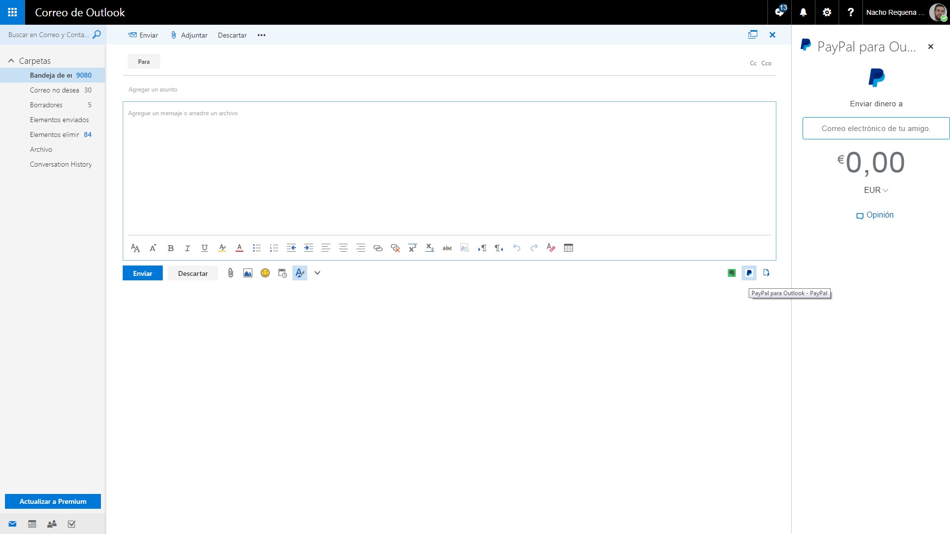 Para usarlo sólo hay que escribir un nuevo mail y verás que justo abajo a la derecha aparece el clásico icono del sistema. Si pulsas sobre él, Hotmail abrirá una ventana justo en el margen derecho, donde hay que poner el nombre de usuario y la contraseña. Hazlo y ya podrás enviar dinero a cualquier persona como si estuvieras dentro de la propia PayPal. Mola, ¿verdad?