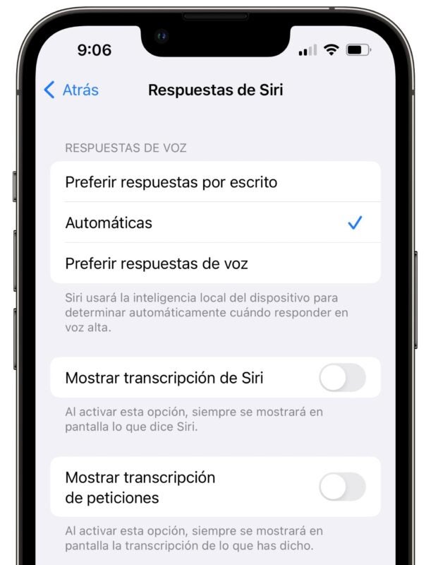 - En Respuestas de Siri configuraremos cómo nos responde el asistente. Podemos Preferir respuestas por escrito, Preferir respuestas de voz o Automático que tiene en cuenta las circunstancias en las que estamos para elegir entre uno u otro. También podemos Mostrar transcripción de Siri para ver qué nos contesta e incluso Mostrar transcripción de peticiones para ver escrito en pantalla qué le estamos preguntando.
