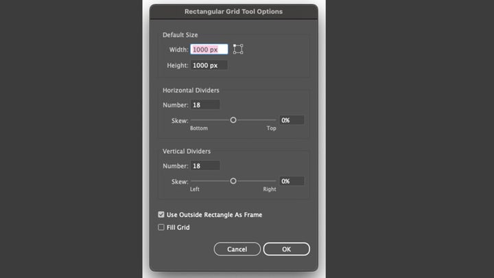 - Clica sobre el lienzo en blanco para que aparezca el panel de Rectangular Grid Tool Options. Bajo Default Size, pondremos 1000 píxeles para la altura y la anchura, al igual que nuestro lienzo. En Dividers, pondremos 18. Clica OK para finalizar.