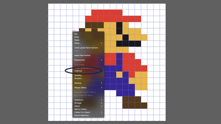 - Cuando termines con tu diseño, haz clic derecho en la cuadrícula y selecciona la opción de Ungroup. Después, ve al menú superior y clica sobre Object > Live Paint > Expand.