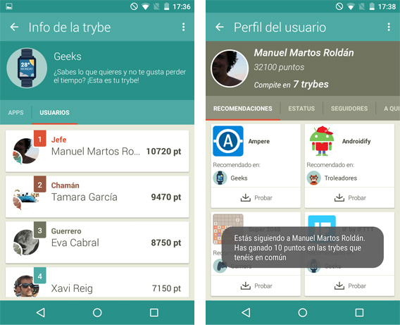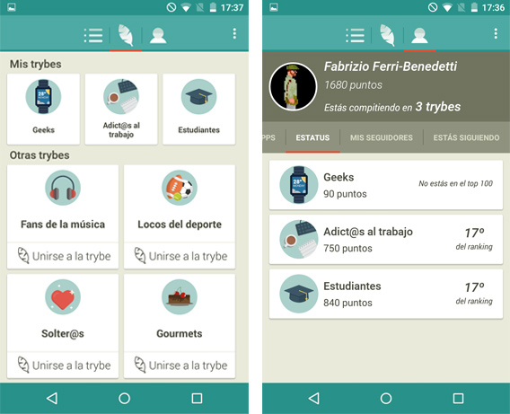 En mi caso me uní a tres trybes que me definen bastante bien: Geeks, Adictos al trabajo y Estudiantes. Y empecé a recomendar apps en cada una de ellas. Coursera, por ejemplo, fue a Estudiantes, mientras que Mobiwol fue directa a Geeks. Divide, por otro lado, solo podía ir a la tribu de Adictos al trabajo (si leéis la descripción de la app entenderéis por qué).